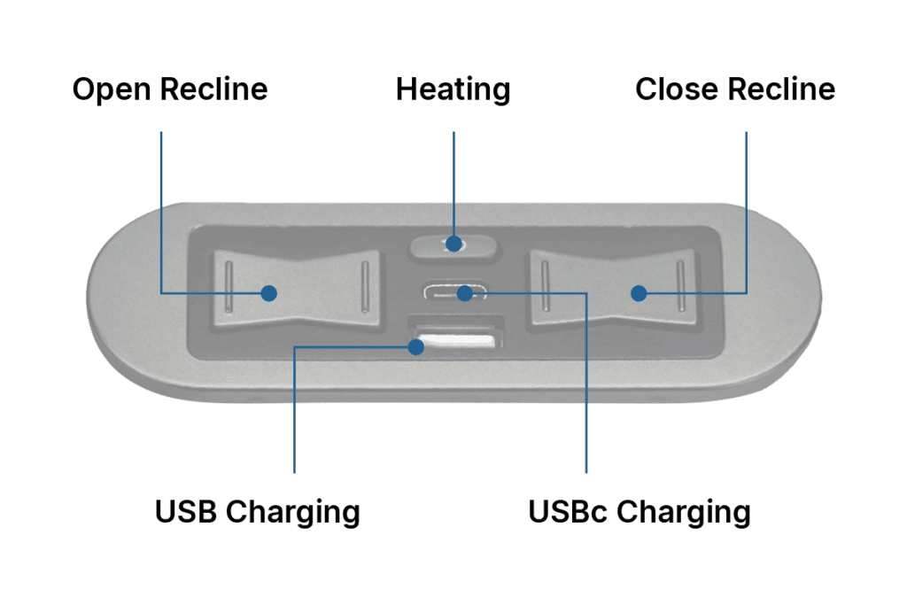 Use the control panel to recline, charge your USB/USBc devices., and heat your seat and lumbar.
